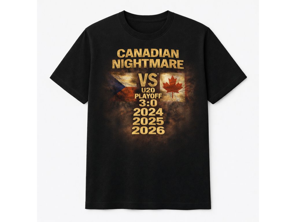 Dominantní nápis CANADIAN NIGHTMARE, česká a kanadská vlajka, skóre 3:0 a roky 2024, 2025, 2026 jasně odkazují na sérii playoff vítězství, která se zapsala do historie juniorského hokeje.