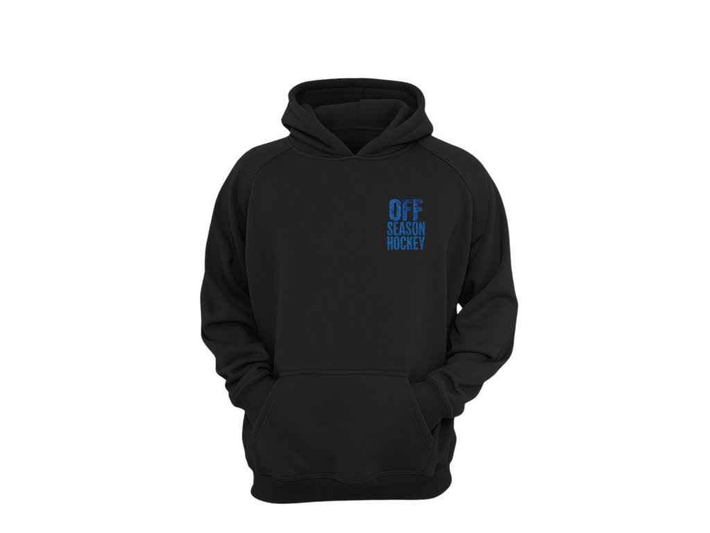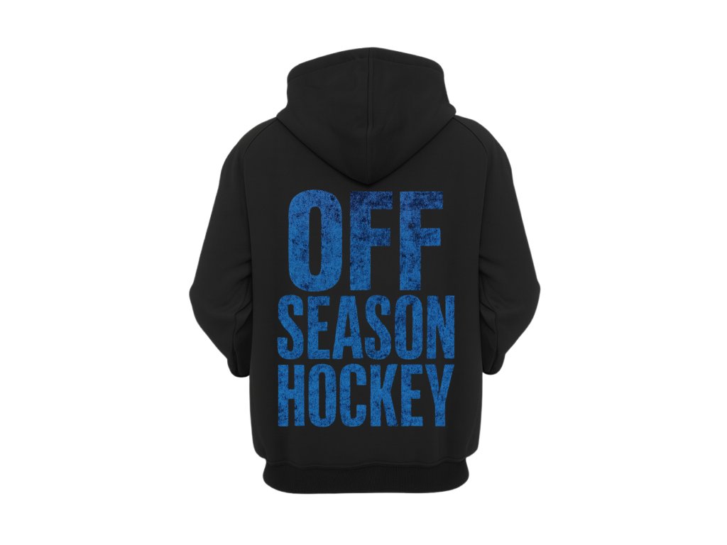 Černá mikina s kapucí a výrazným potiskem OFF SEASON HOCKEY na zádech. Masivní modrý nápis v „opotřebovaném“ stylu dává mikině drsný hokejový charakter, který tě odliší jak na zimáku, tak ve městě.