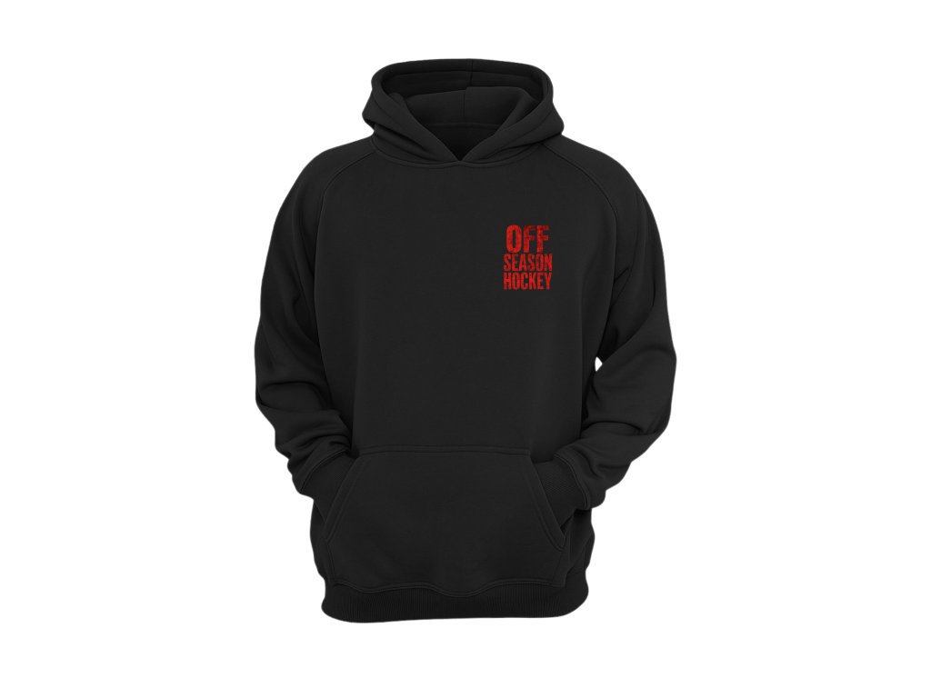 Černá mikina s kapucí a výrazným potiskem OFF SEASON HOCKEY na zádech. Masivní červený nápis v „opotřebovaném“ stylu dává mikině drsný hokejový charakter, který tě odliší jak na zimáku, tak ve městě.
