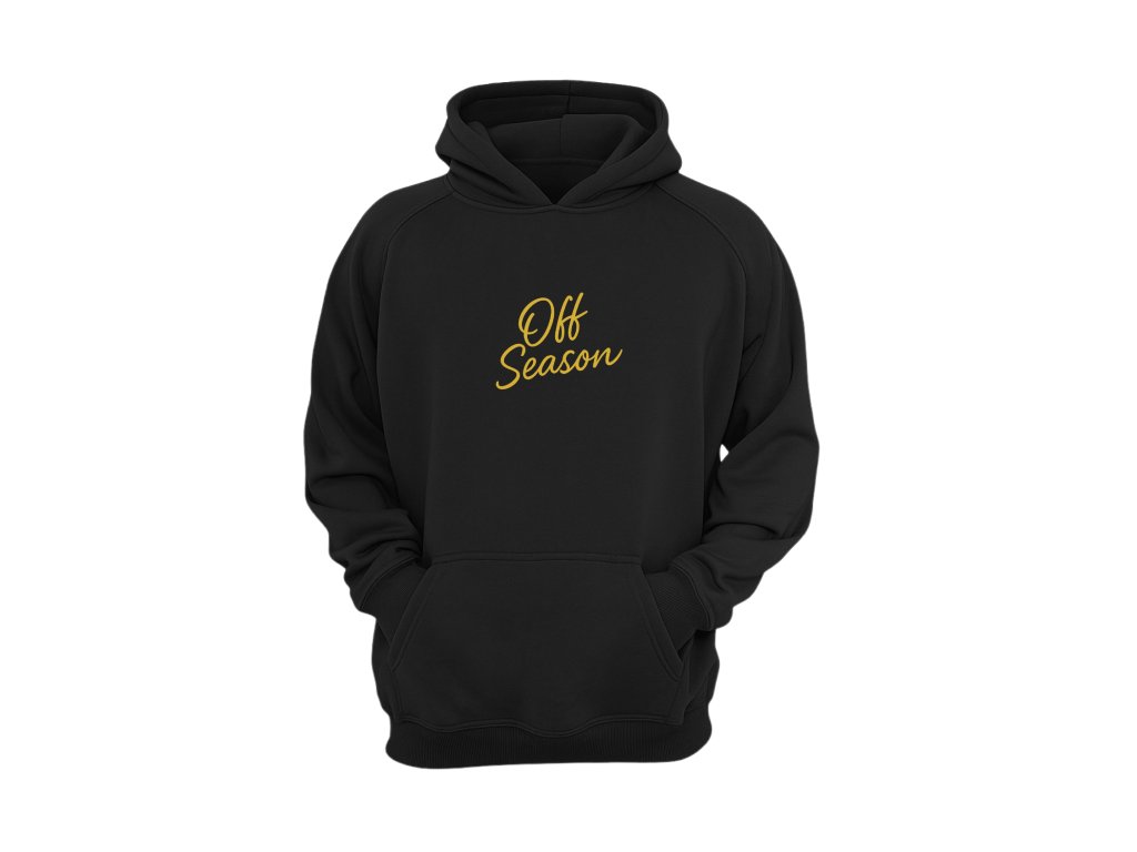 Kvalitní černá mikina s kapucí, která zaujme minimalistickým a elegantním designem. Na přední straně je decentní výšivka Off Season ve zlatém provedení, která dodává mikině jedinečný vzhled a luxusní nádech. Mikina má klokaní kapsu, žebrované manžety a spodní lem pro pohodlné nošení a lepší tvarovou stálost. Díky příjemnému materiálu se skvěle hodí jak na volný čas, tak na každodenní nošení. Moderní střih zaručuje komfort a styl v každé situaci.