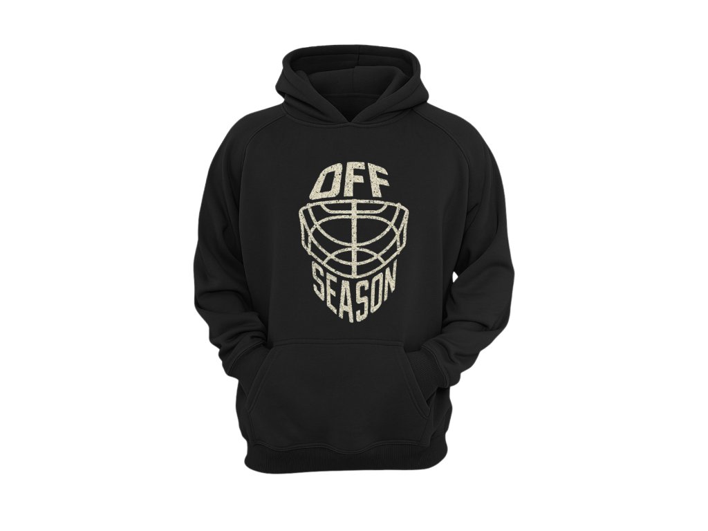 Pohodlná černá mikina s kapucí, která zaujme hokejovým designem. Na přední straně je originální potisk brankářské masky s nápisem OFF SEASON, provedený v lehce vintage stylu. Mikina je vyrobena z příjemného materiálu, má klokaní kapsu a pružné lemy na rukávech i spodním okraji. Skvělý kousek pro všechny hokejové gólmany i fanoušky, kteří chtějí vyjádřit svou vášeň pro hru.